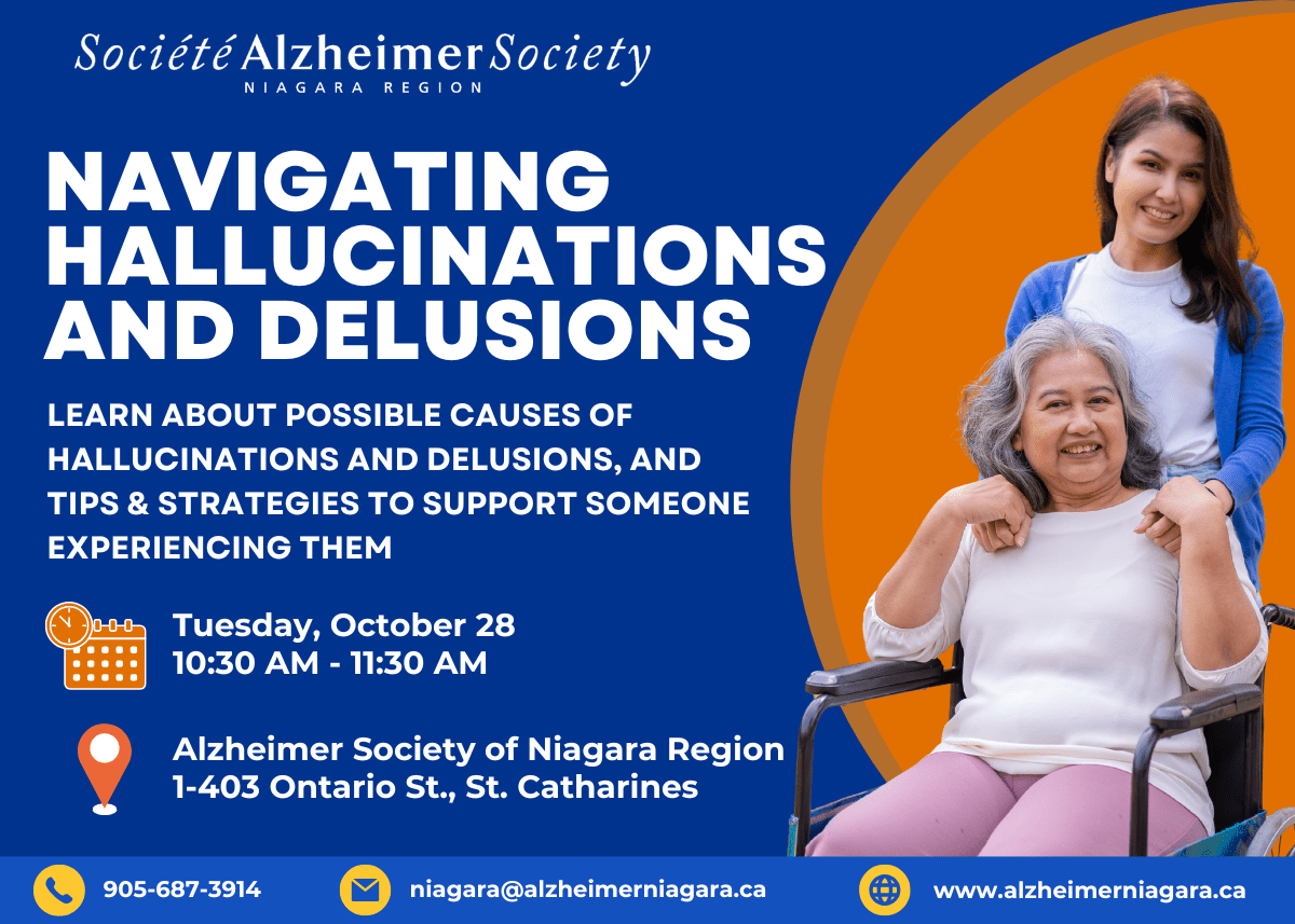 Join the Alzheimer Society of Niagara Region as they discuss possible causes of hallucinations and delusions, and tips and strategies to support a person who is experiencing hallucinations and delusions.